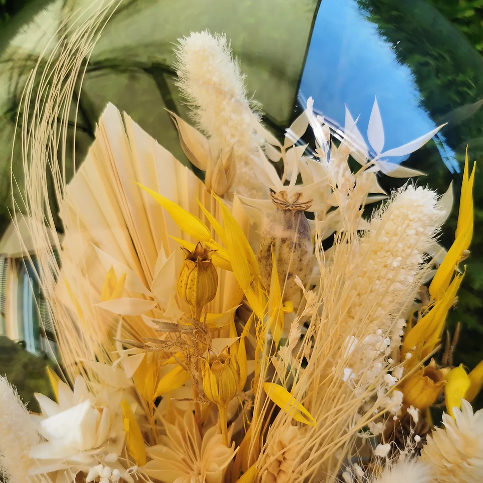 Je ne travaille que les fleurs séchées et stabilisées qui par définition ne se fanent pas et se conservent de nombreuses années.